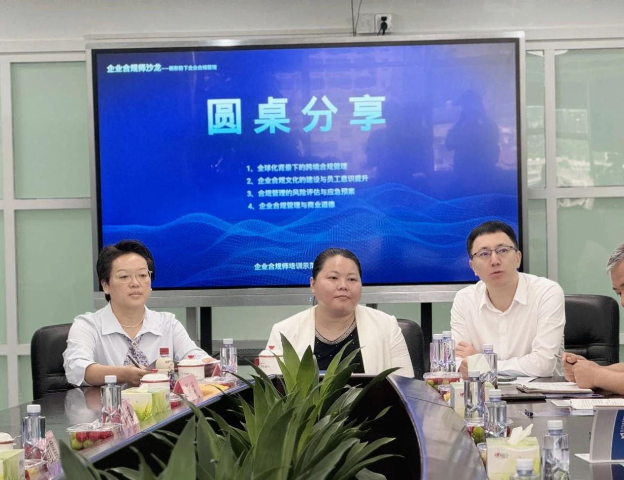 刘红霞主持圆桌分享交流,敬礼、刘溪两位专家围绕全球化背景下的跨境合规管理、企业合规文化的建设与员工意识提升、合规管理的风险评估与应急预案、企业合规管理与商业道德四个方面展开分享。